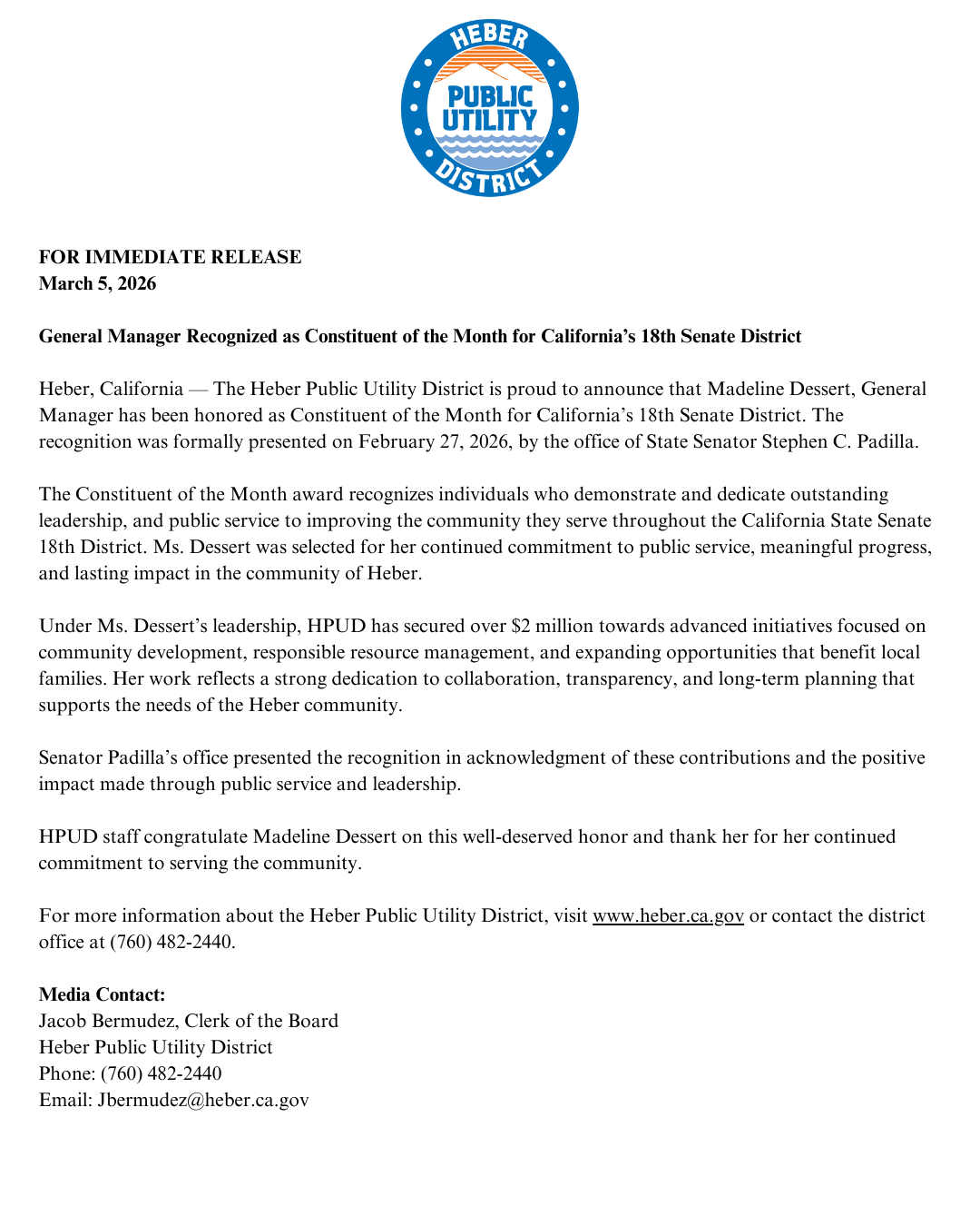 General Manager Recognized as Constituent of the Month for California’s 18th Senate District