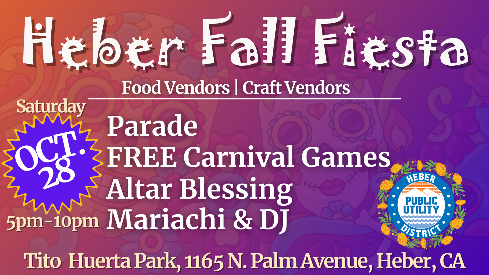 If you would like to be a vendor at our Heber Fall Fiesta, come into our office and pick up an application at 1078 Dogwood Rd, Suite 103, Heber, CA 92249 or find it online at www.heber.ca.gov. Applications for vendors are due on October 6, 2023 before 4:30pm.
