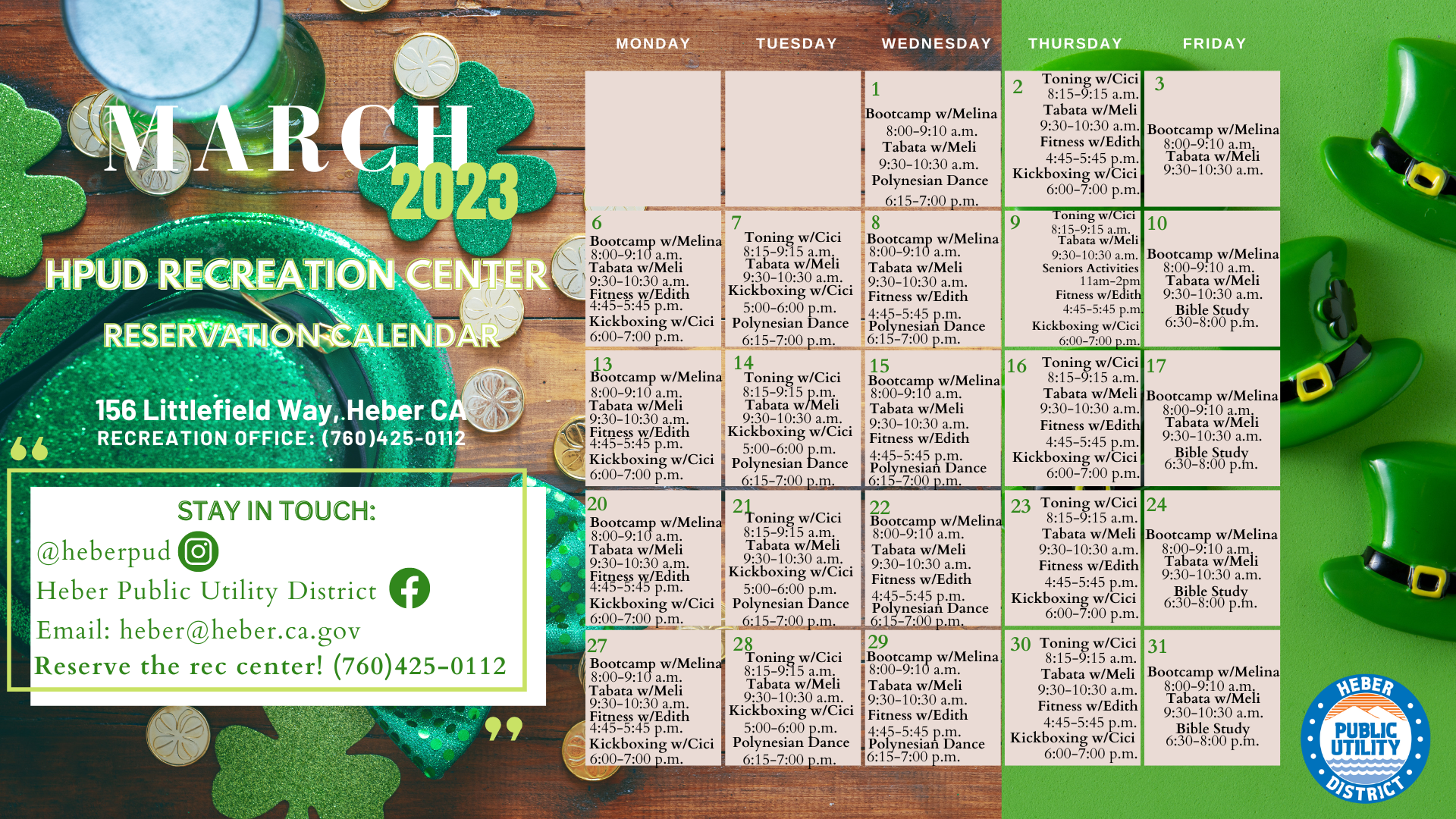 The HPUD Recreation Center Reservation Calendar for March 2023 is now published and available.